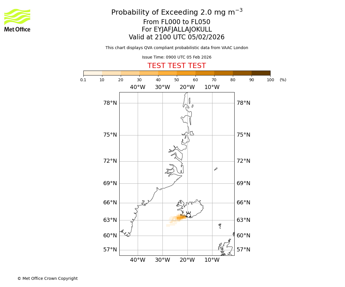 Probability of exceeding 2.0 milligrams per metre cubed. From 000 to 050 for EYJAFJALLAJOKULL. Valid at 1800 UTC 05/02/2026