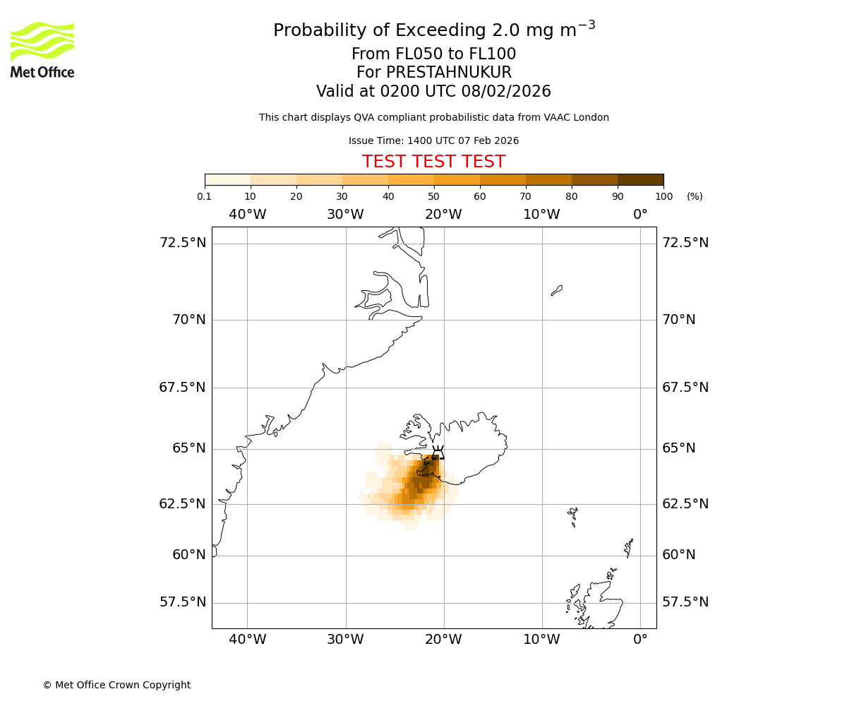 Modelled ash concentration from 000 to 200 for PRESTAHNUKUR. Valid at 1400 UTC 07/02/2026