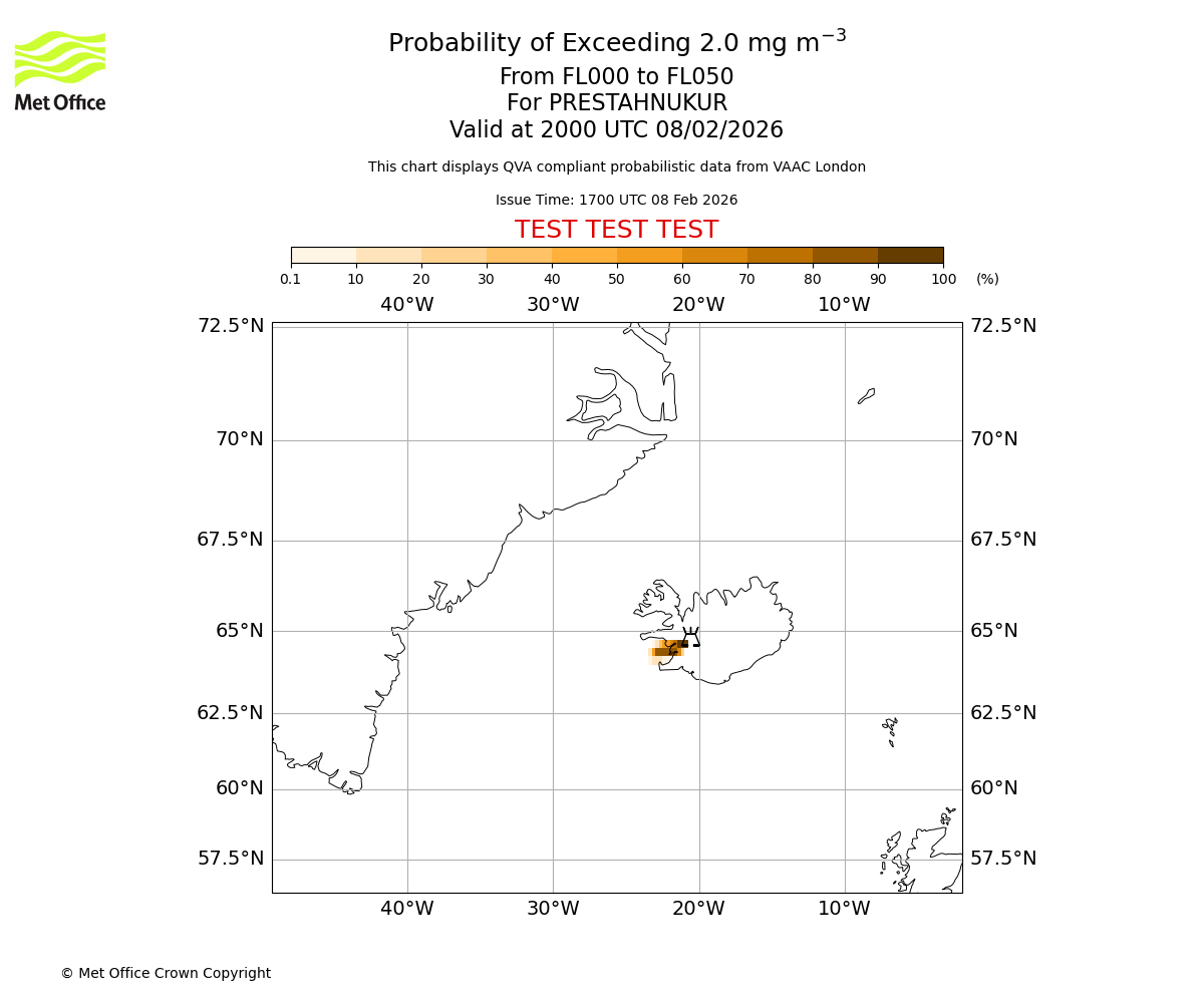 Modelled ash concentration from 000 to 050 for PRESTAHNUKUR. Valid at 1700 UTC 08/02/2026