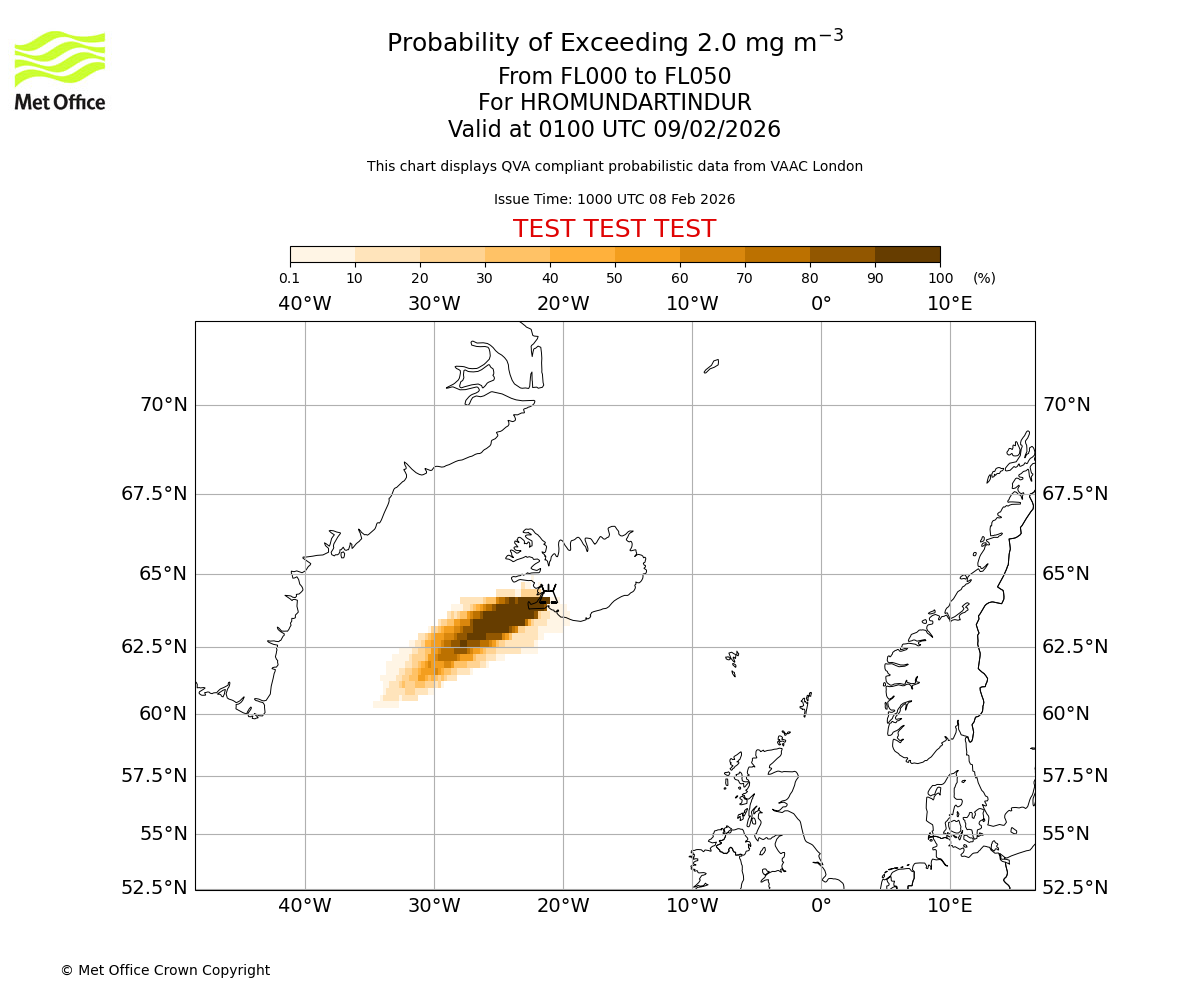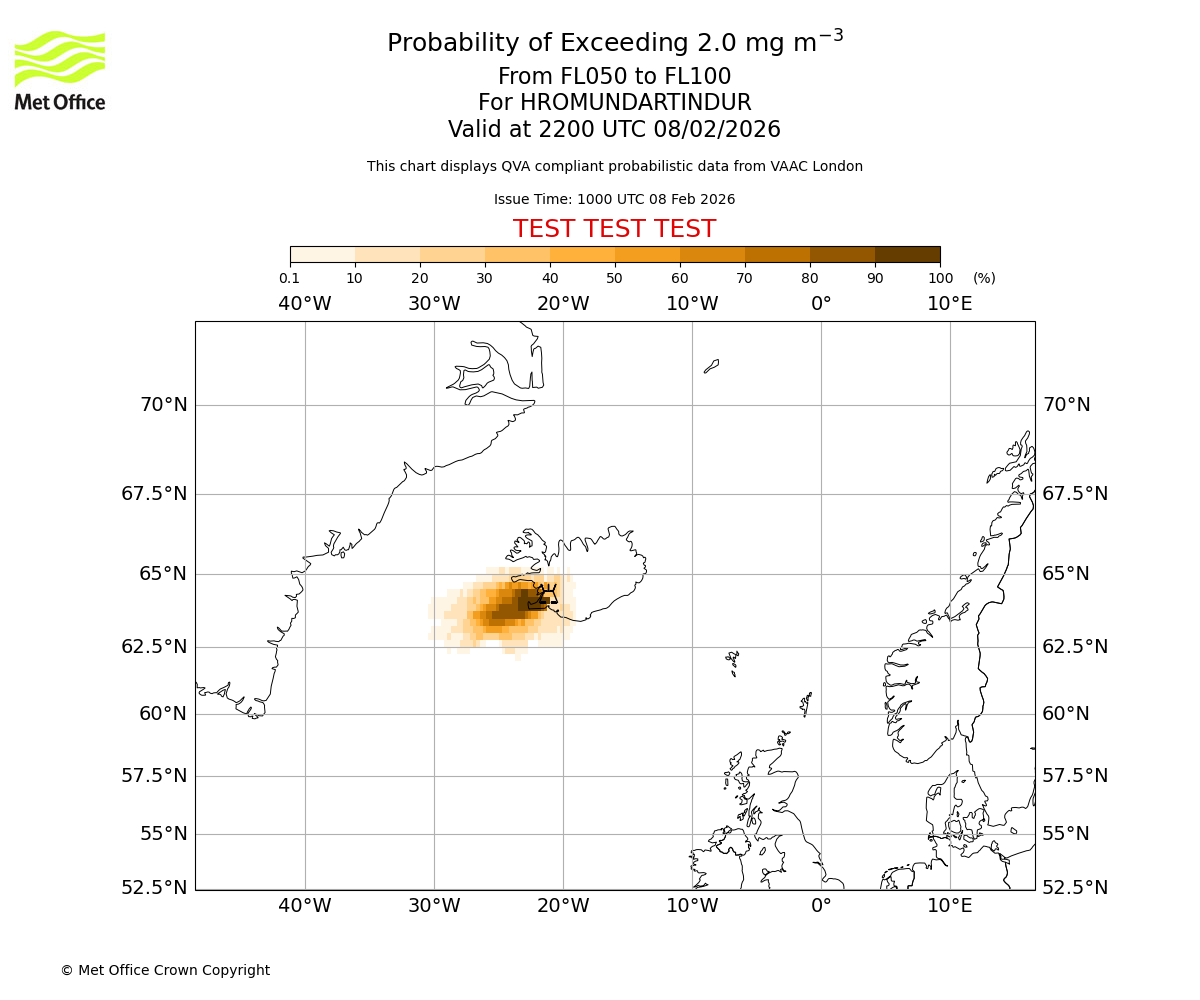 Modelled ash concentration from 000 to 050 for HROMUNDARTINDUR. Valid at 1000 UTC 08/02/2026