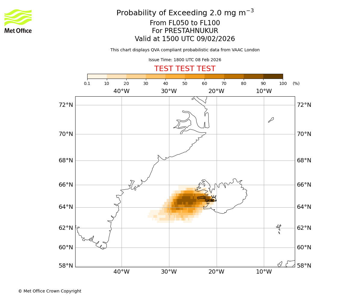 Probability of exceeding 2.0 milligrams per metre cubed. From 000 to 050 for PRESTAHNUKUR. Valid at 1500 UTC 09/02/2026
