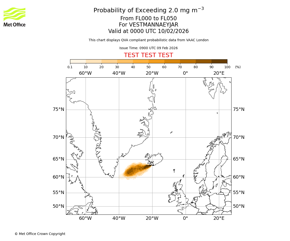 Probability of exceeding 2.0 milligrams per metre cubed. From 000 to 050 for VESTMANNAEYJAR. Valid at 2100 UTC 09/02/2026