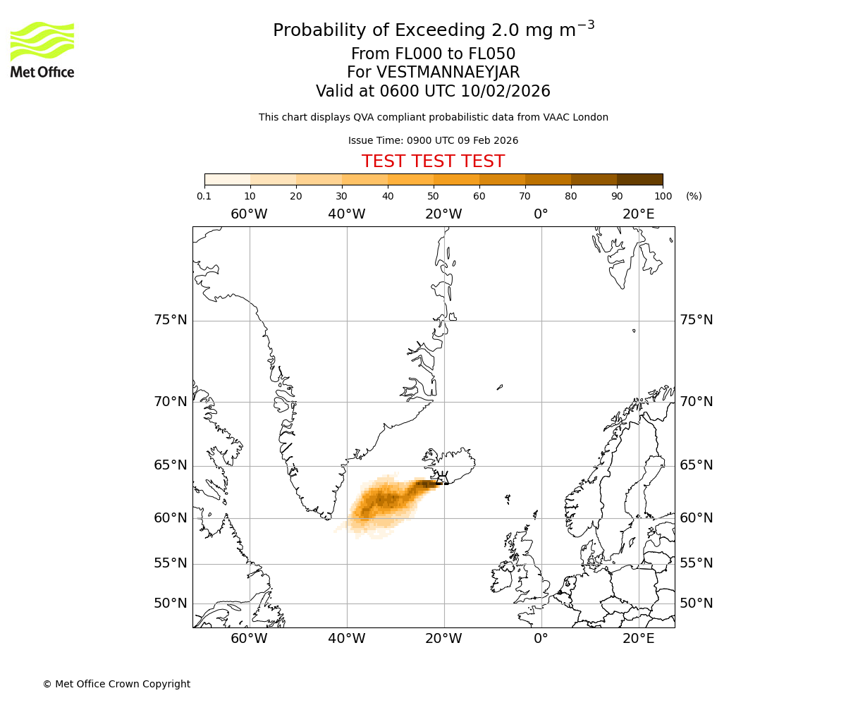 Modelled ash concentration from 000 to 050 for VESTMANNAEYJAR. Valid at 0900 UTC 09/02/2026