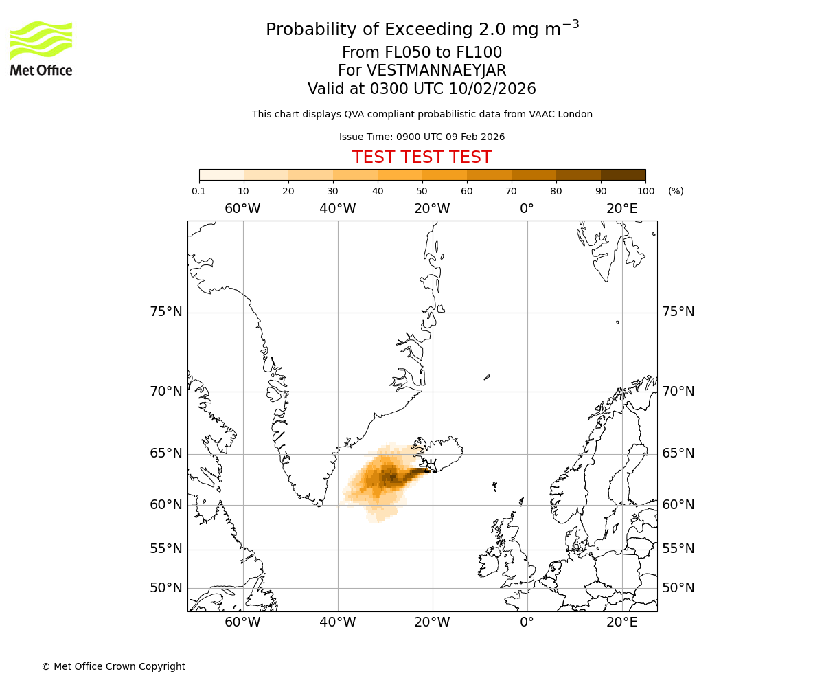 Probability of exceeding 2.0 milligrams per metre cubed. From 000 to 050 for VESTMANNAEYJAR. Valid at 0300 UTC 10/02/2026