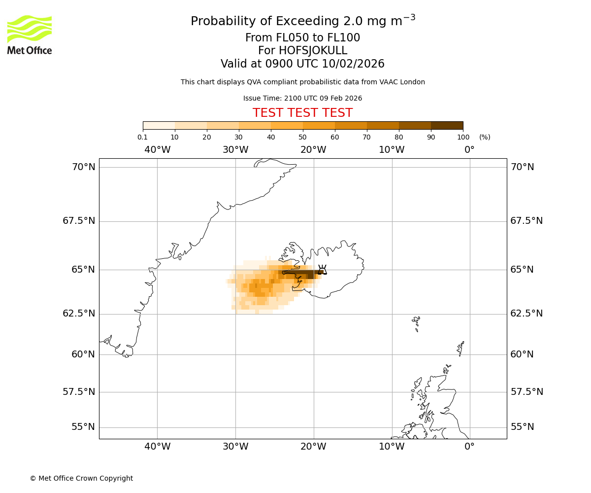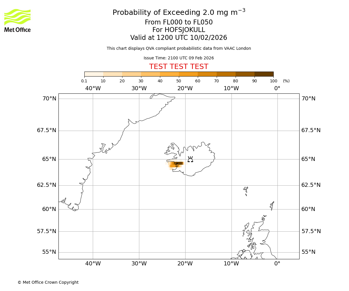 Probability of exceeding 2.0 milligrams per metre cubed. From 000 to 050 for HOFSJOKULL. Valid at 0900 UTC 10/02/2026