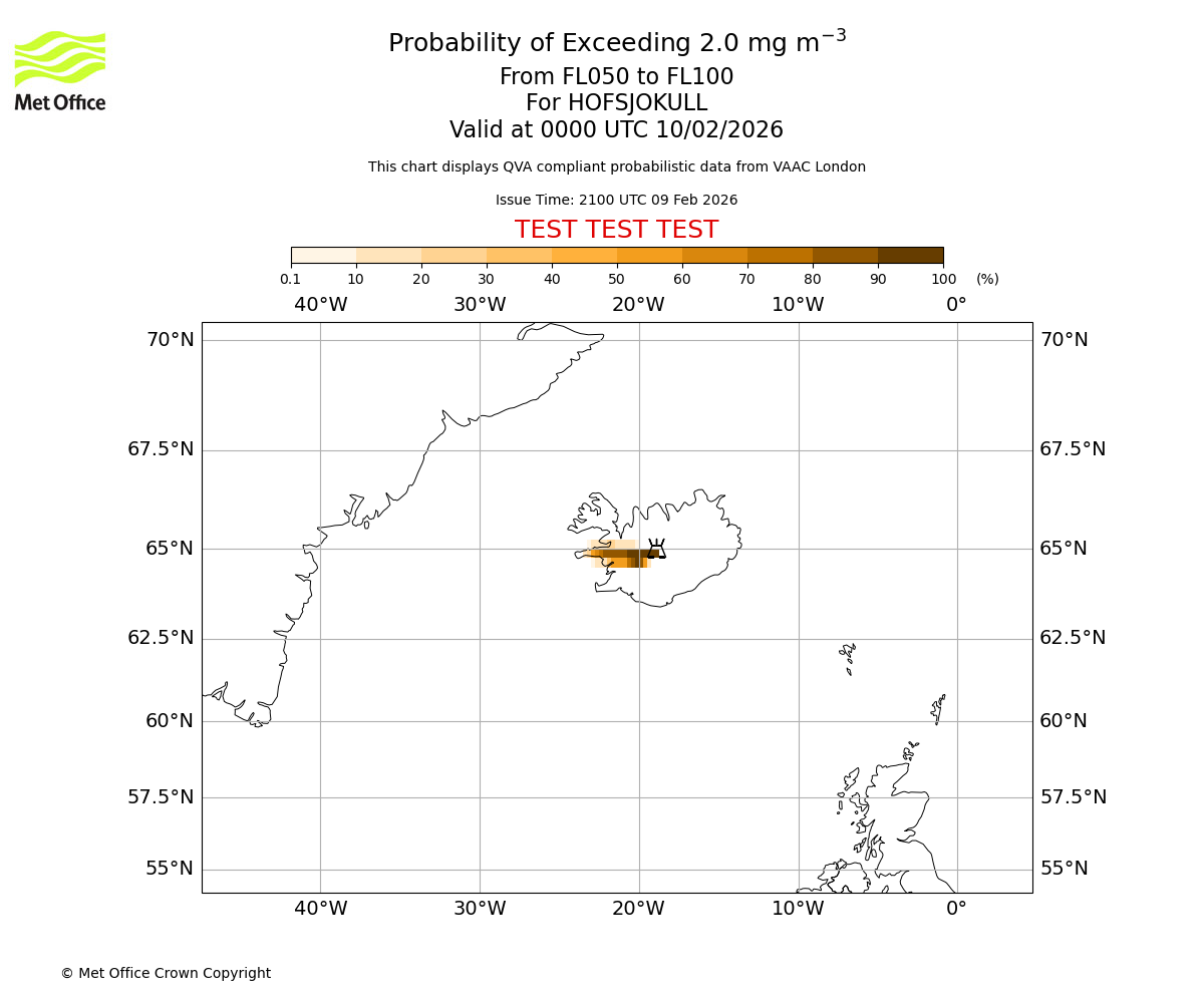 Probability of exceeding 2.0 milligrams per metre cubed. From 000 to 050 for HOFSJOKULL. Valid at 0000 UTC 10/02/2026