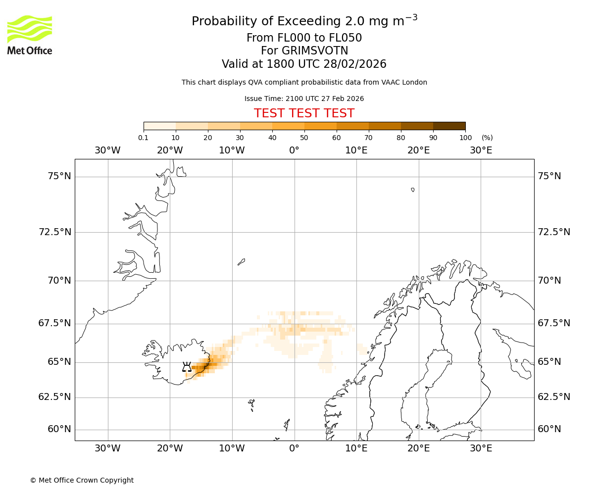 Modelled ash concentration from 000 to 050 for GRIMSVOTN. Valid at 2100 UTC 27/02/2026