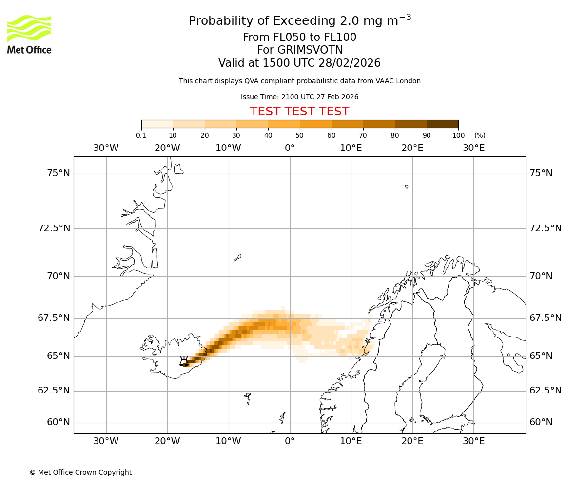 Probability of exceeding 2.0 milligrams per metre cubed. From 000 to 050 for GRIMSVOTN. Valid at 1500 UTC 28/02/2026