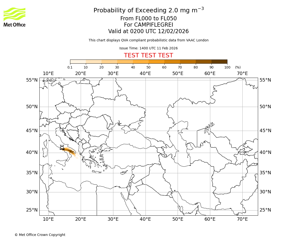 Quantitative Volcanic Ash charts (QVA) are produced in accordance with International Civil Aviation Organization (ICAO) Annex 3 requirements and are provided as well as the London Volcanic Ash Advisory Graphics (VAG) and Advisories (VAA). The lowest QVA threshold (0.2 mg/m³) matches to the areas depicted in the VAA and VAG. Both expected ash concentration and probabilistic forecast information is provided in the chart viewer below for eruptions occurring in the London Volcanic Ash Advisory Centre (VAAC) area of responsibility.