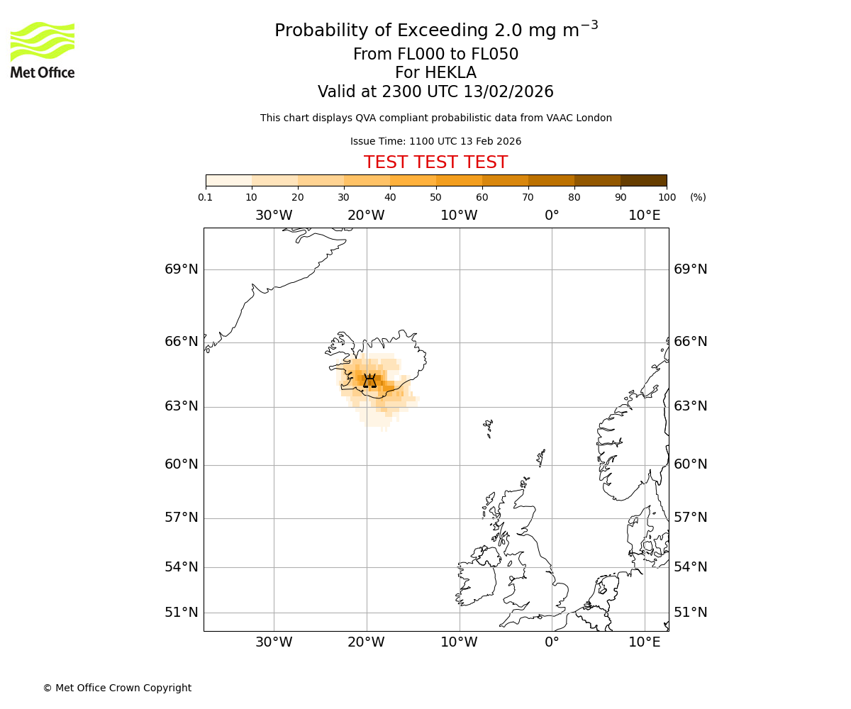 Modelled ash concentration from 000 to 200 for HEKLA. Valid at 1100 UTC 13/02/2026