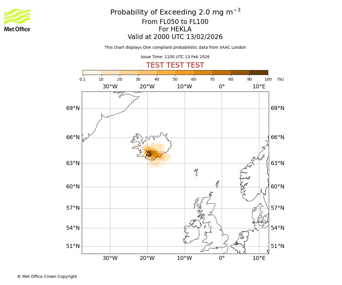 Probability of exceeding 2.0 milligrams per metre cubed. From 000 to 050 for HEKLA. Valid at 2000 UTC 13/02/2026