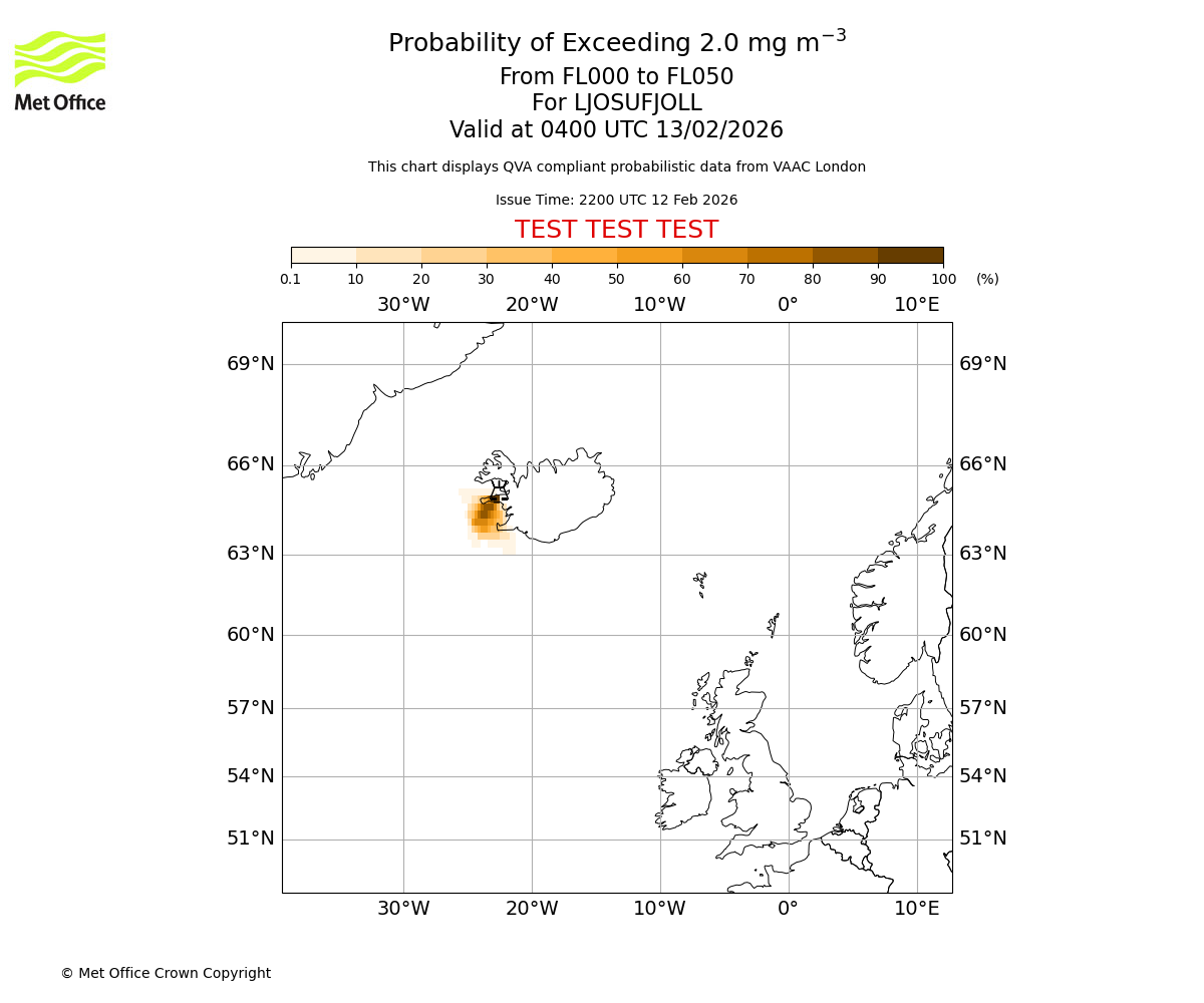 Modelled ash concentration from 000 to 050 for LJOSUFJOLL. Valid at 2200 UTC 12/02/2026