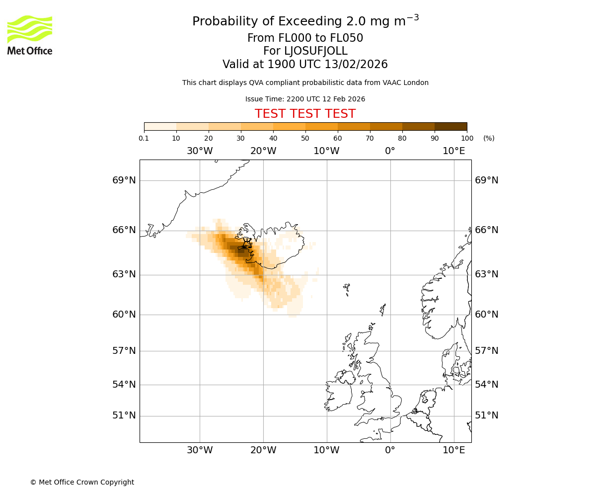 Modelled ash concentration from 000 to 050 for LJOSUFJOLL. Valid at 2200 UTC 12/02/2026