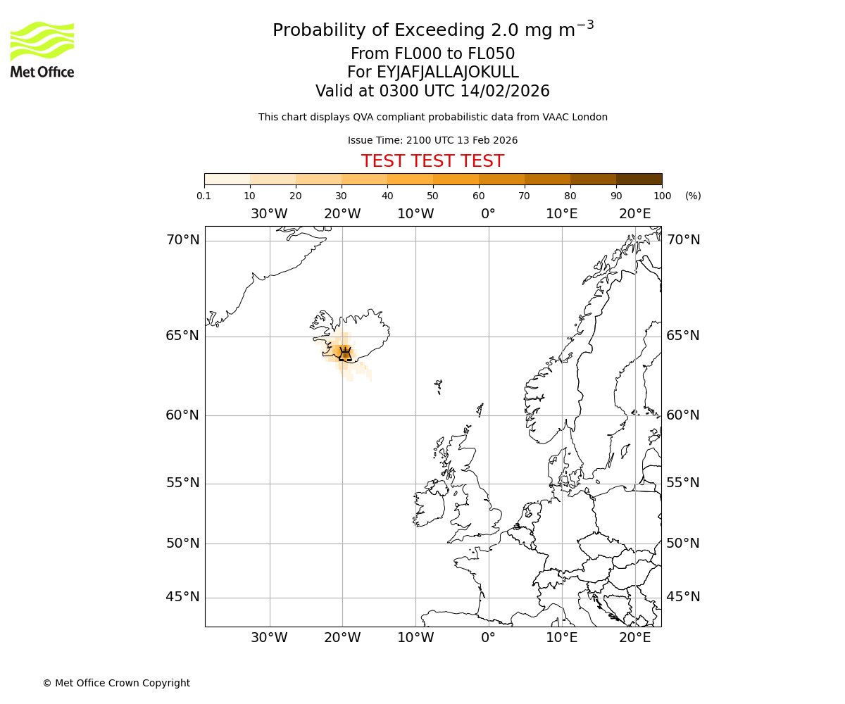 Probability of exceeding 2.0 milligrams per metre cubed. From 000 to 050 for EYJAFJALLAJOKULL. Valid at 0000 UTC 14/02/2026