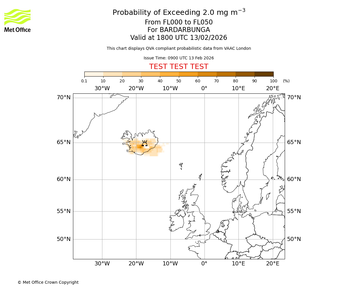 Modelled ash concentration from 000 to 050 for BARDARBUNGA. Valid at 0900 UTC 13/02/2026