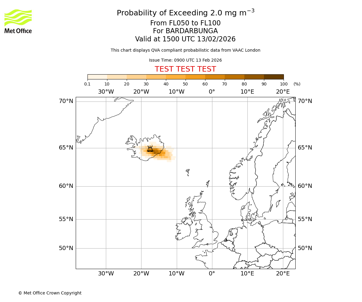Modelled ash concentration from 000 to 200 for BARDARBUNGA. Valid at 0900 UTC 13/02/2026