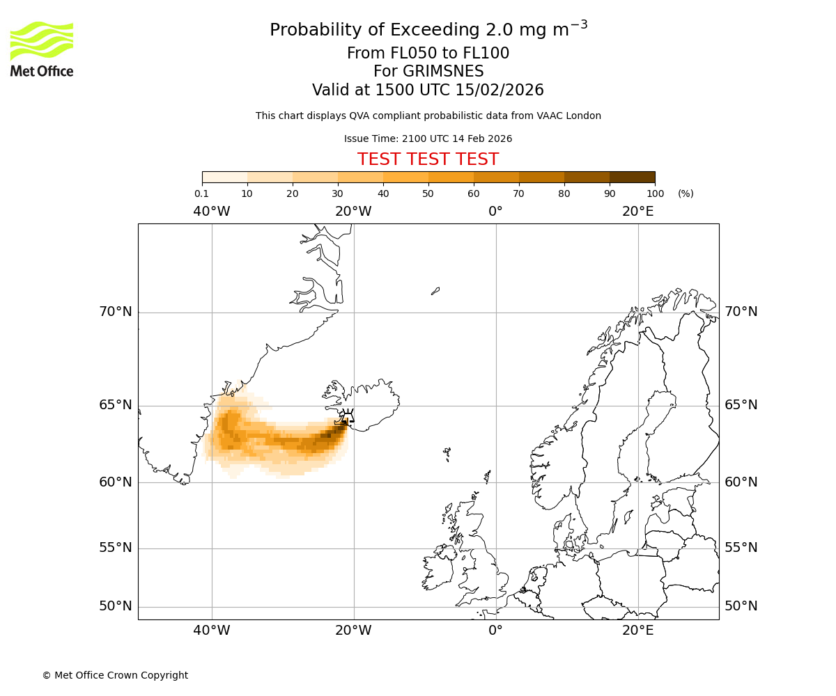 Modelled ash concentration from 000 to 200 for GRIMSNES. Valid at 2100 UTC 14/02/2026