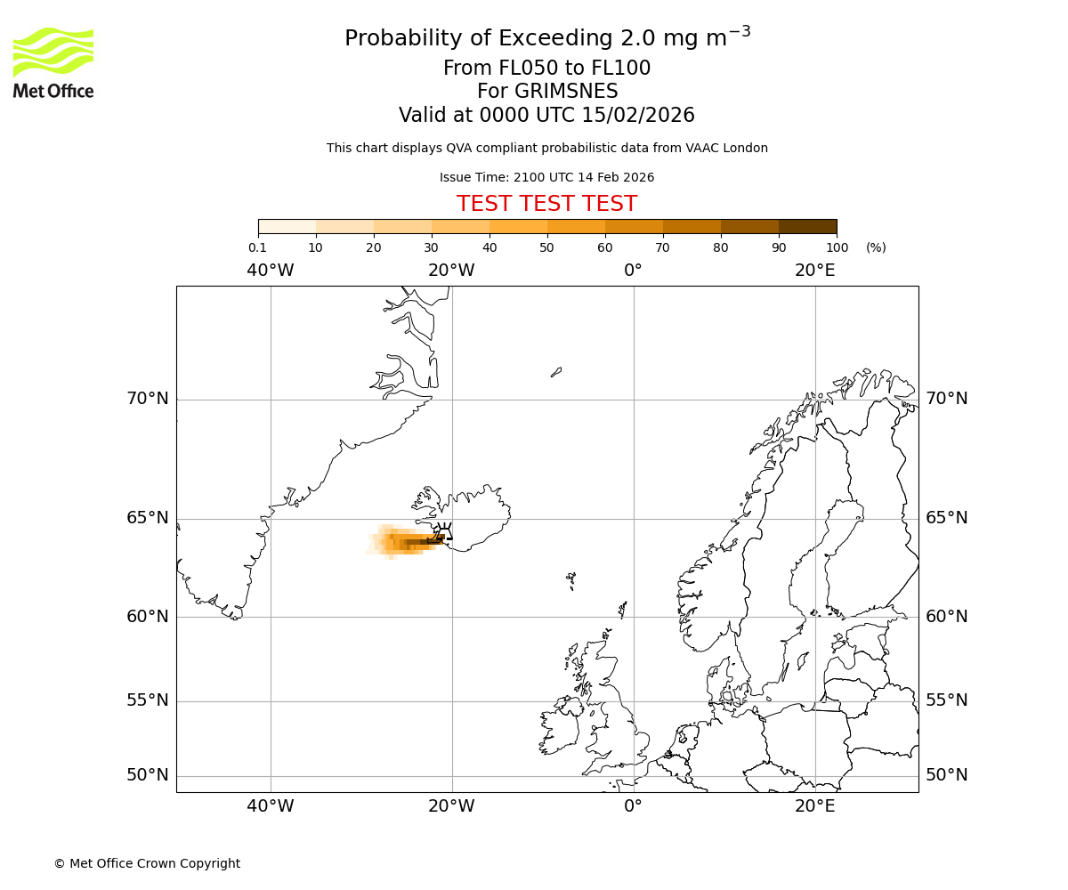 Probability of exceeding 2.0 milligrams per metre cubed. From 000 to 050 for GRIMSNES. Valid at 0000 UTC 15/02/2026
