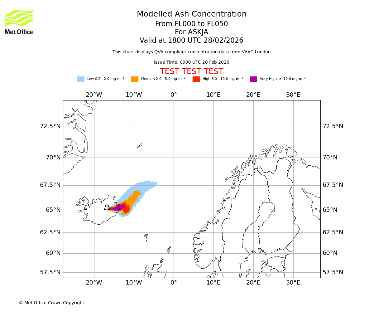 Modelled ash concentration from 000 to 200 for ASKJA. Valid at 0900 UTC 28/02/2026