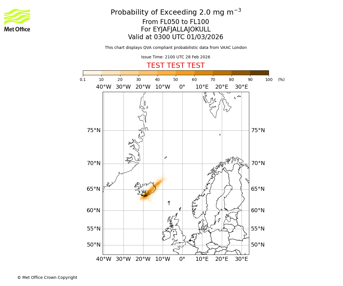 Probability of exceeding 2.0 milligrams per metre cubed. From 000 to 050 for EYJAFJALLAJOKULL. Valid at 0300 UTC 01/03/2026