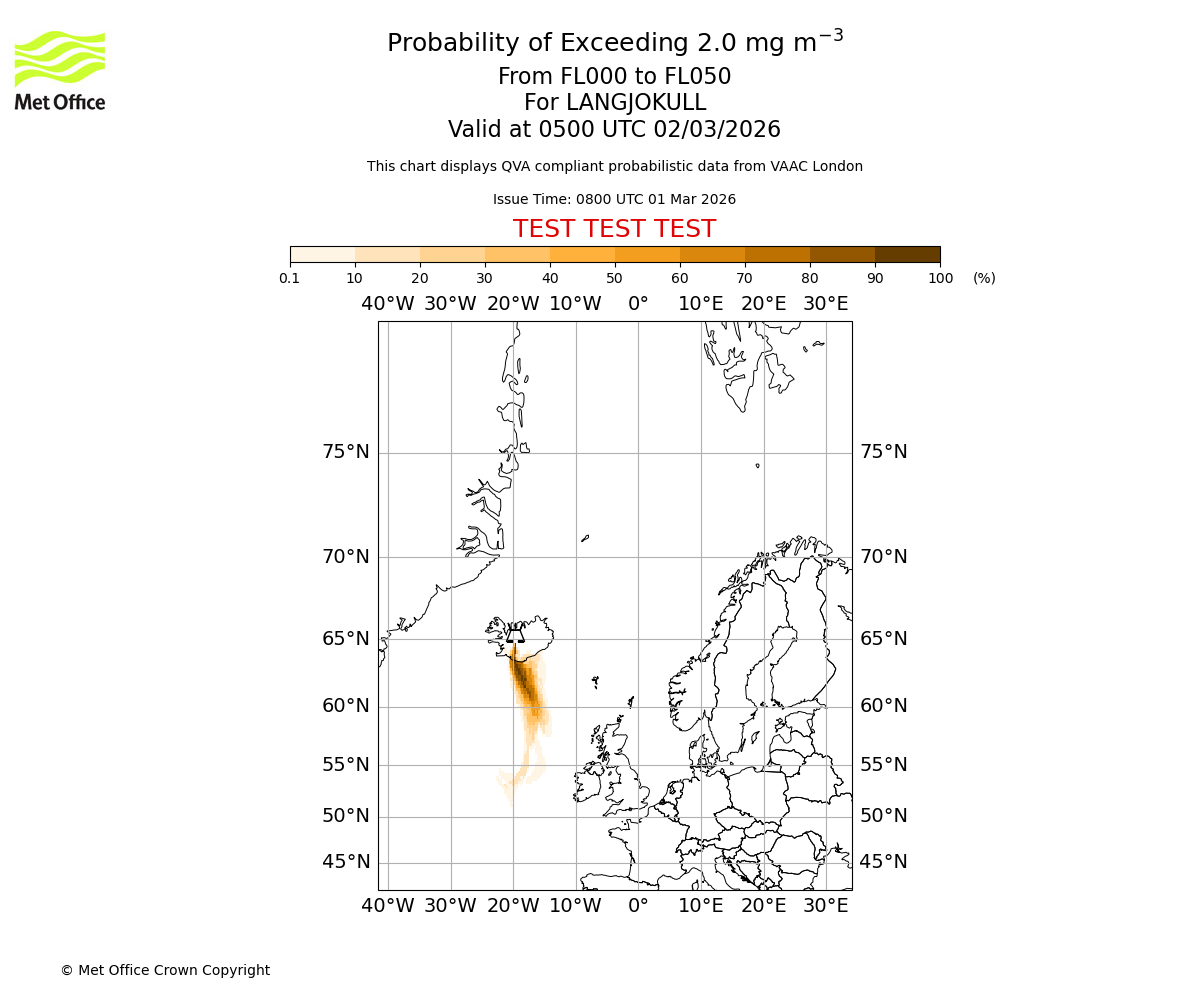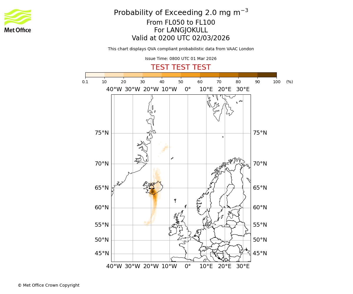 Probability of exceeding 2.0 milligrams per metre cubed. From 000 to 050 for LANGJOKULL. Valid at 0200 UTC 02/03/2026