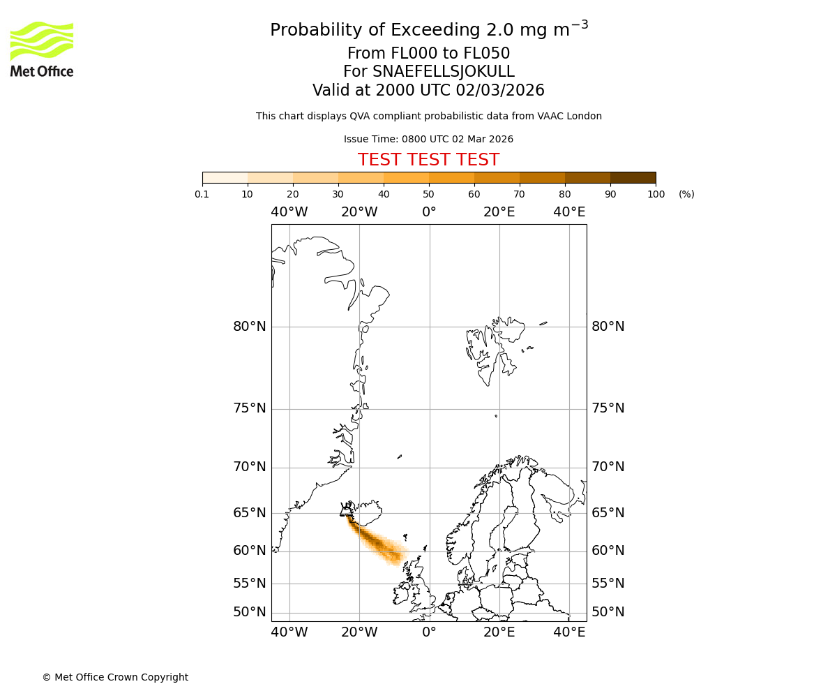 Modelled ash concentration from 000 to 200 for SNAEFELLSJOKULL. Valid at 0800 UTC 02/03/2026