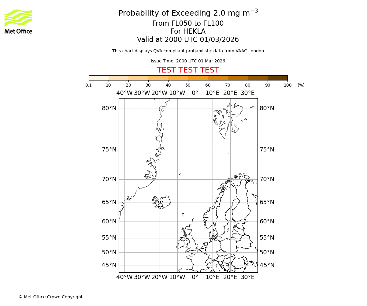Probability of exceeding 2.0 milligrams per metre cubed. From 000 to 050 for HEKLA. Valid at 2000 UTC 01/03/2026
