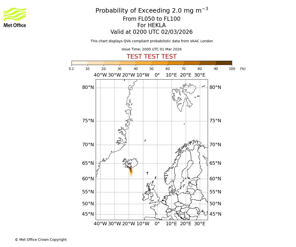 Probability of exceeding 2.0 milligrams per metre cubed. From 000 to 050 for HEKLA. Valid at 0200 UTC 02/03/2026