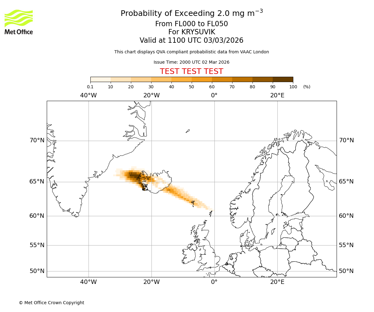 Modelled ash concentration from 000 to 050 for KRYSUVIK. Valid at 2000 UTC 02/03/2026