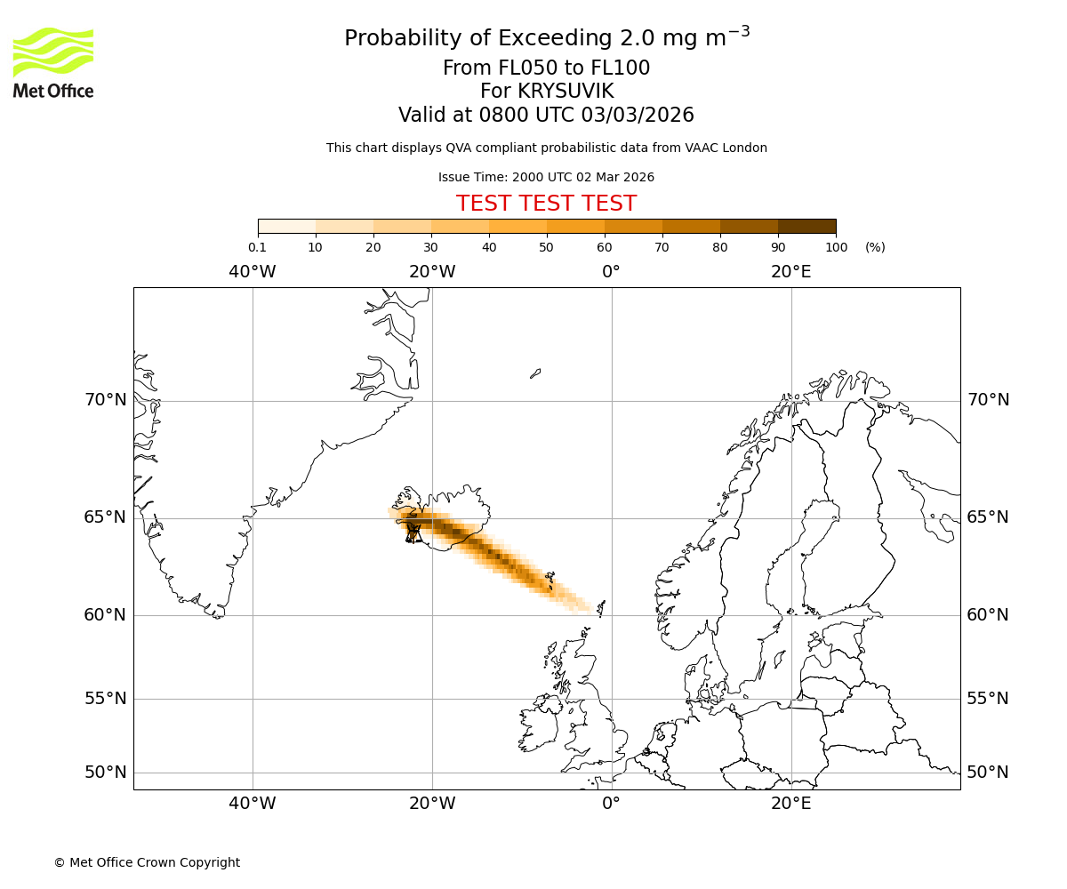 Probability of exceeding 2.0 milligrams per metre cubed. From 000 to 050 for KRYSUVIK. Valid at 0800 UTC 03/03/2026