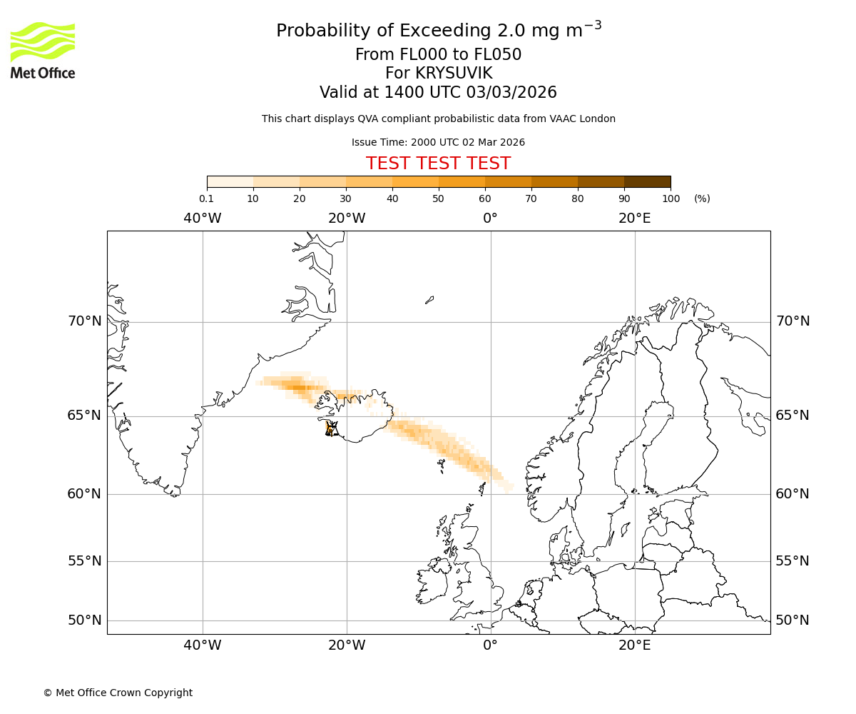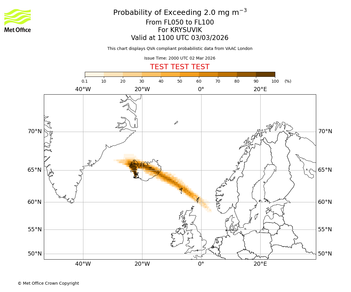 Probability of exceeding 2.0 milligrams per metre cubed. From 000 to 050 for KRYSUVIK. Valid at 1100 UTC 03/03/2026