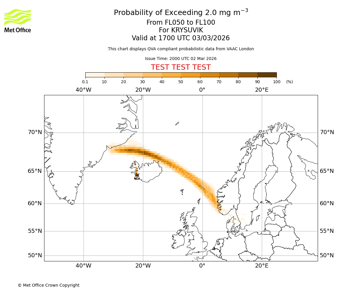 Probability of exceeding 2.0 milligrams per metre cubed. From 000 to 050 for KRYSUVIK. Valid at 1700 UTC 03/03/2026