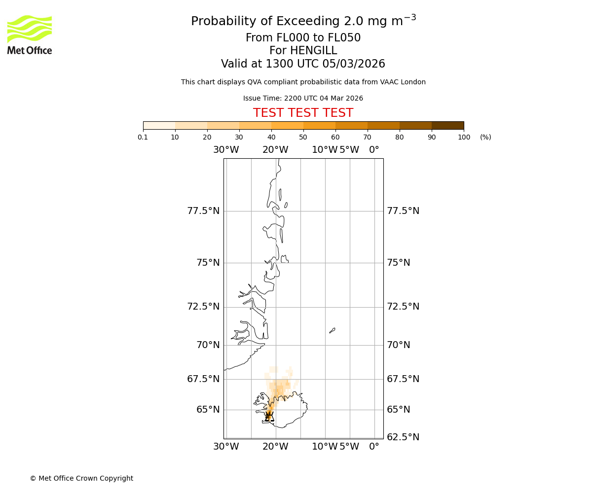 Modelled ash concentration from 000 to 050 for HENGILL. Valid at 2200 UTC 04/03/2026