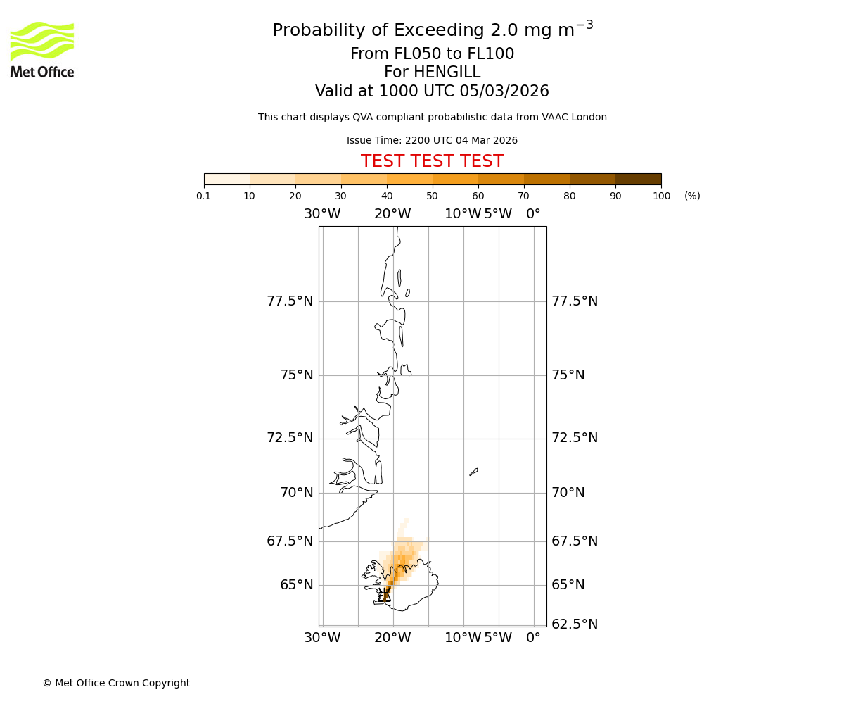 Probability of exceeding 2.0 milligrams per metre cubed. From 000 to 050 for HENGILL. Valid at 1000 UTC 05/03/2026