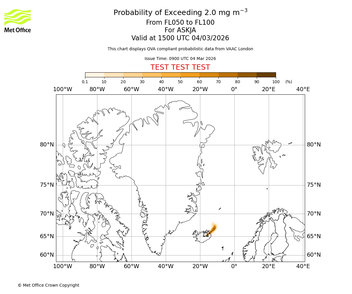 Probability of exceeding 2.0 milligrams per metre cubed. From 000 to 050 for ASKJA. Valid at 1500 UTC 04/03/2026
