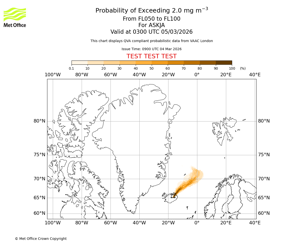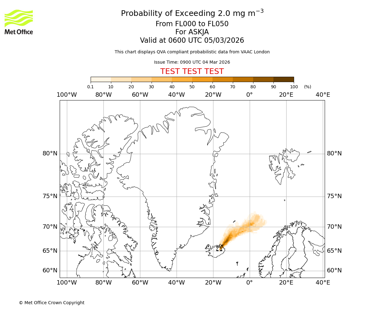 Probability of exceeding 2.0 milligrams per metre cubed. From 000 to 050 for ASKJA. Valid at 0300 UTC 05/03/2026