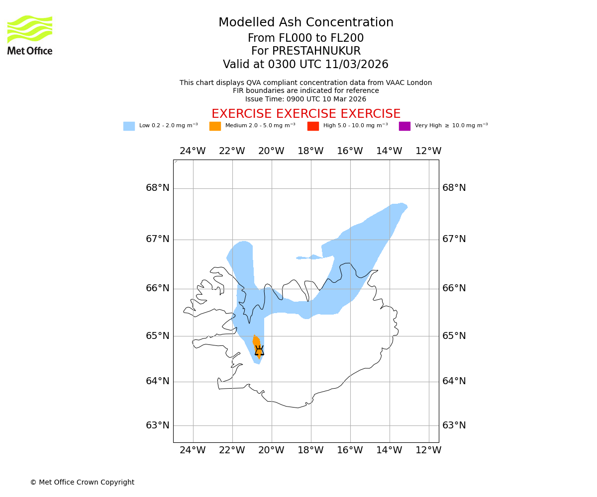 Modelled ash concentration from 000 to 050 for PRESTAHNUKUR. Valid at 0900 UTC 10/03/2026