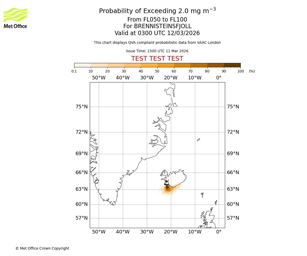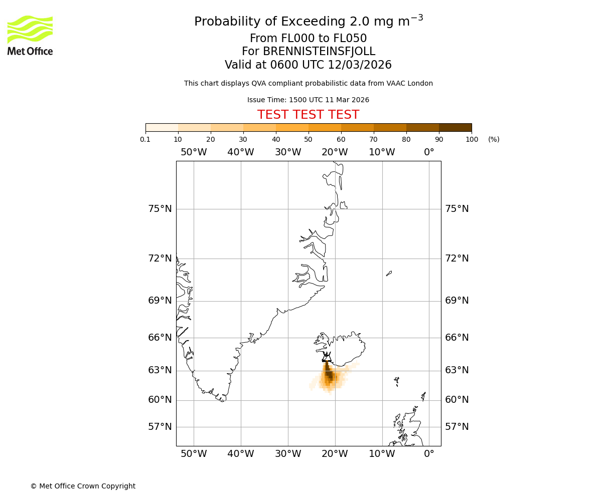 Quantitative Volcanic Ash charts (QVA) are produced in accordance with International Civil Aviation Organization (ICAO) Annex 3 requirements and are provided as well as the London Volcanic Ash Advisory Graphics (VAG) and Advisories (VAA). The lowest QVA threshold (0.2 mg/m³) matches to the areas depicted in the VAA and VAG. Both expected ash concentration and probabilistic forecast information is provided in the chart viewer below for eruptions occurring in the London Volcanic Ash Advisory Centre (VAAC) area of responsibility.