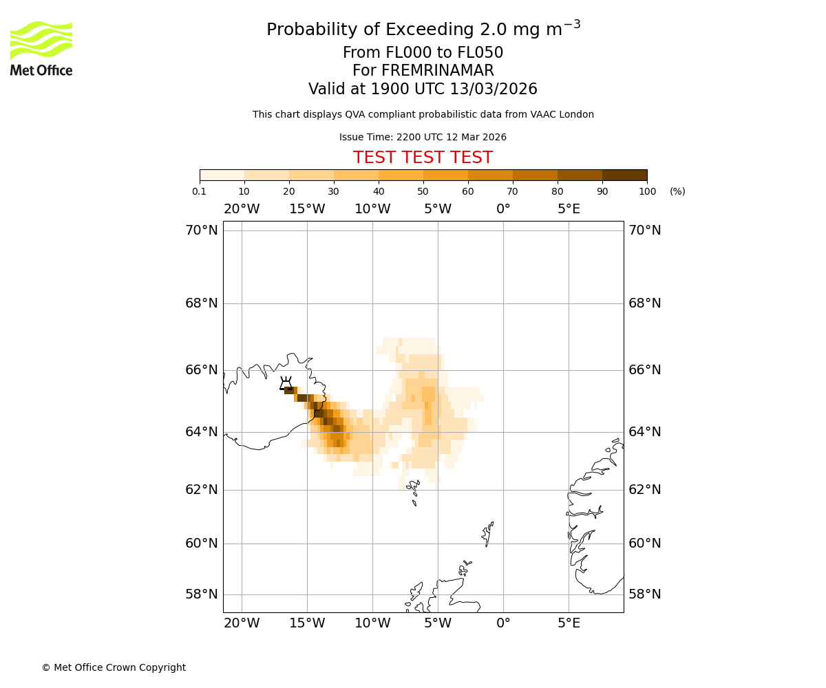 Modelled ash concentration from 000 to 050 for FREMRINAMAR. Valid at 2200 UTC 12/03/2026