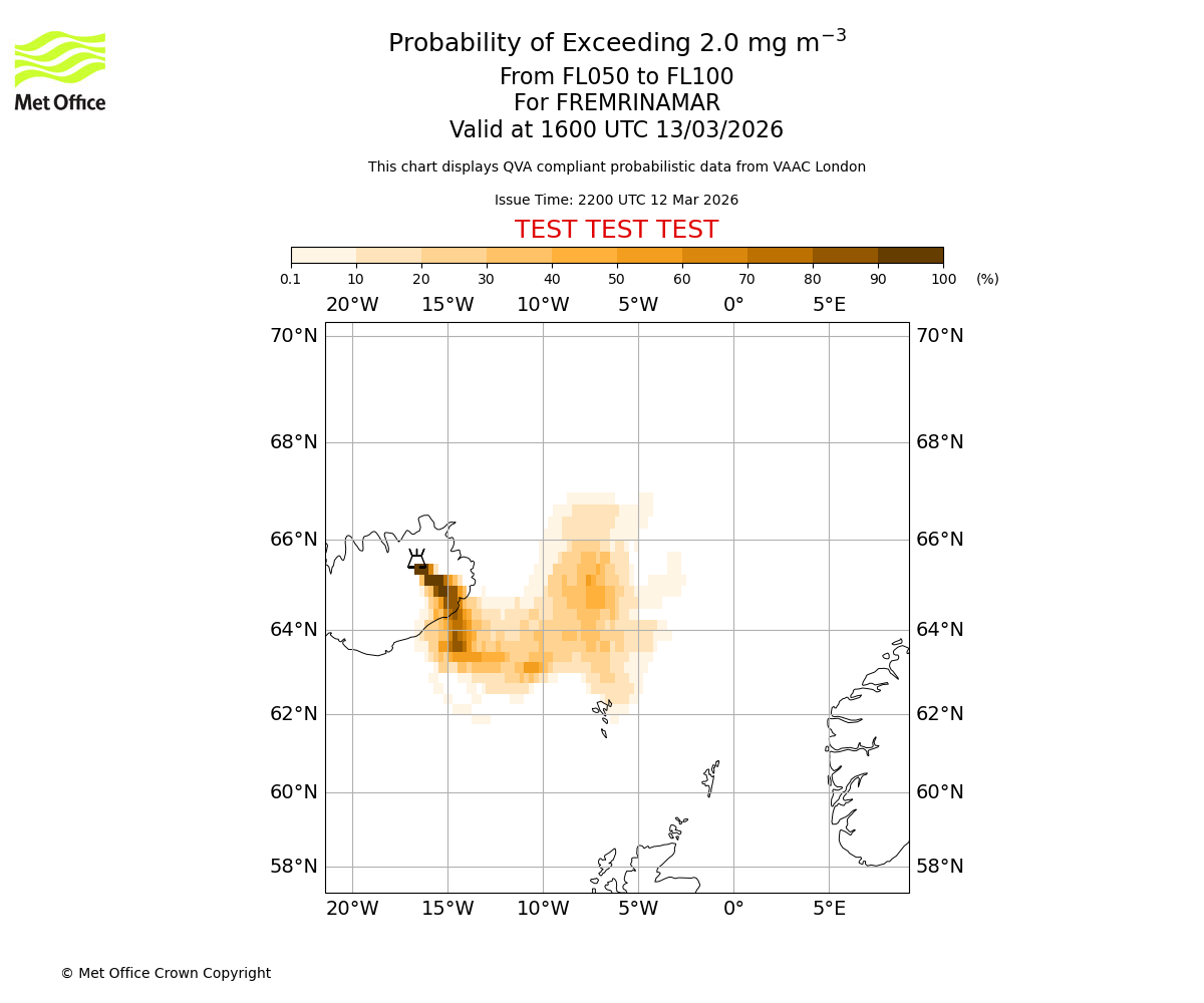 Quantitative Volcanic Ash charts (QVA) are produced in accordance with International Civil Aviation Organization (ICAO) Annex 3 requirements and are provided as well as the London Volcanic Ash Advisory Graphics (VAG) and Advisories (VAA). The lowest QVA threshold (0.2 mg/m³) matches to the areas depicted in the VAA and VAG. Both expected ash concentration and probabilistic forecast information is provided in the chart viewer below for eruptions occurring in the London Volcanic Ash Advisory Centre (VAAC) area of responsibility.