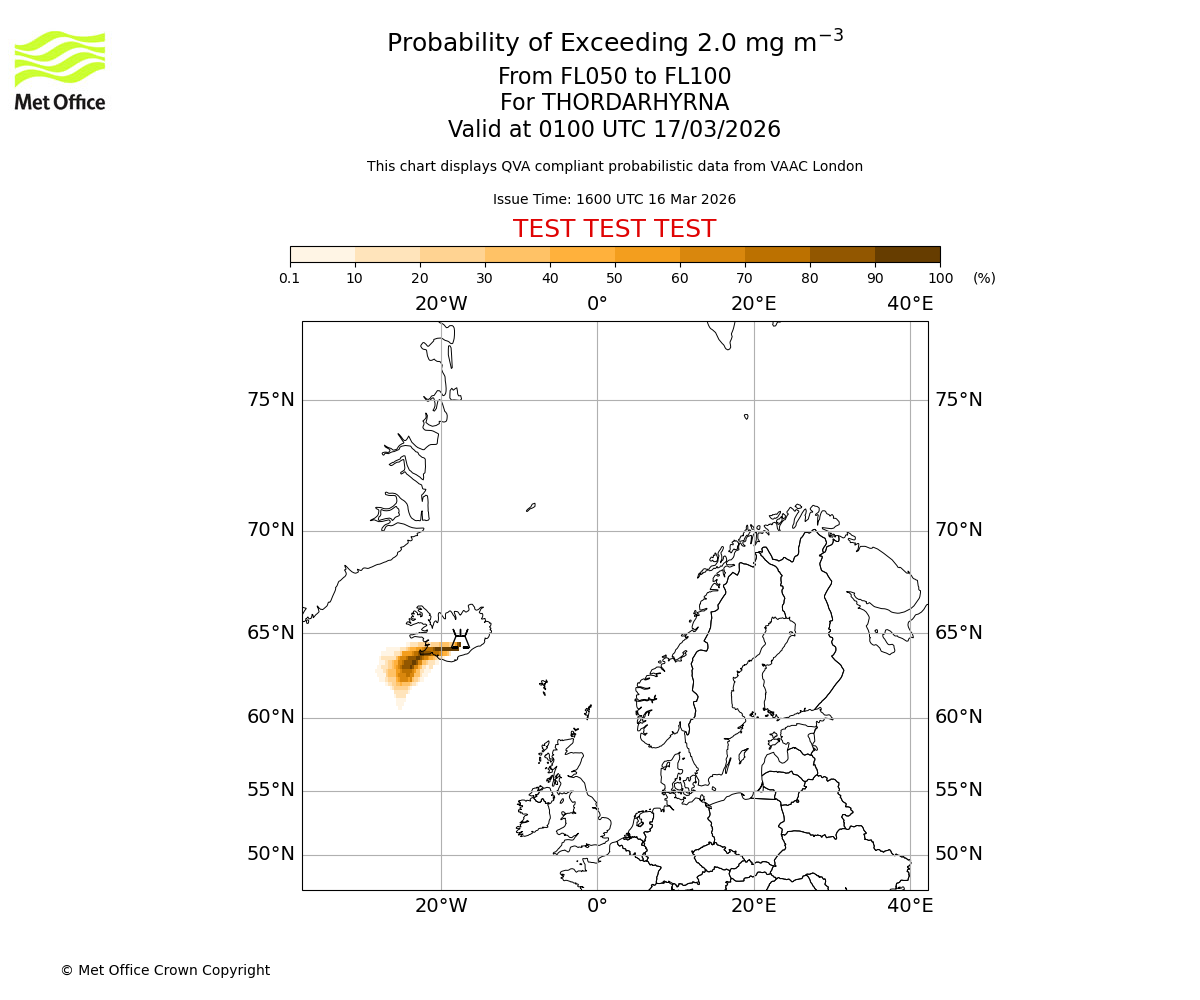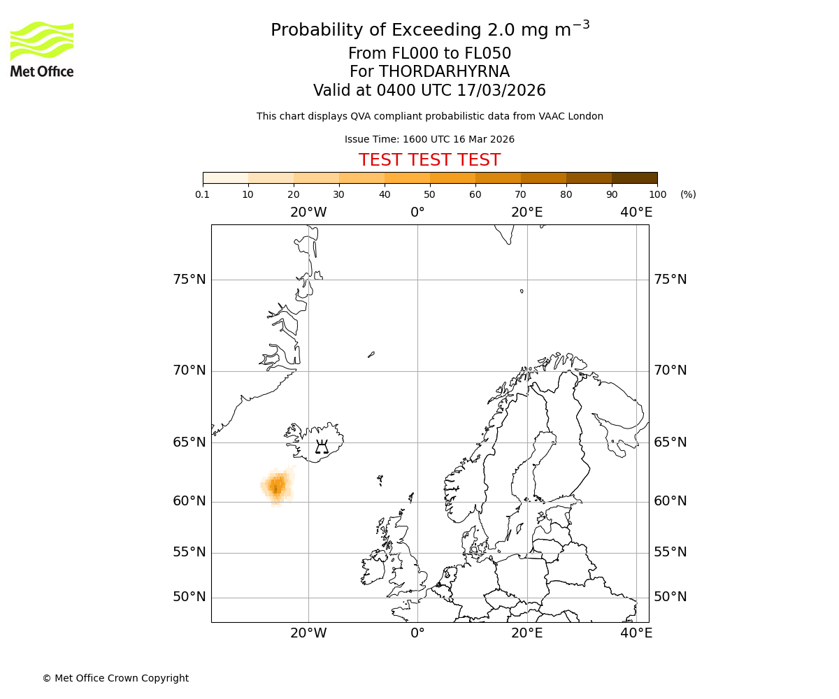 Modelled ash concentration from 000 to 050 for THORDARHYRNA. Valid at 1600 UTC 16/03/2026