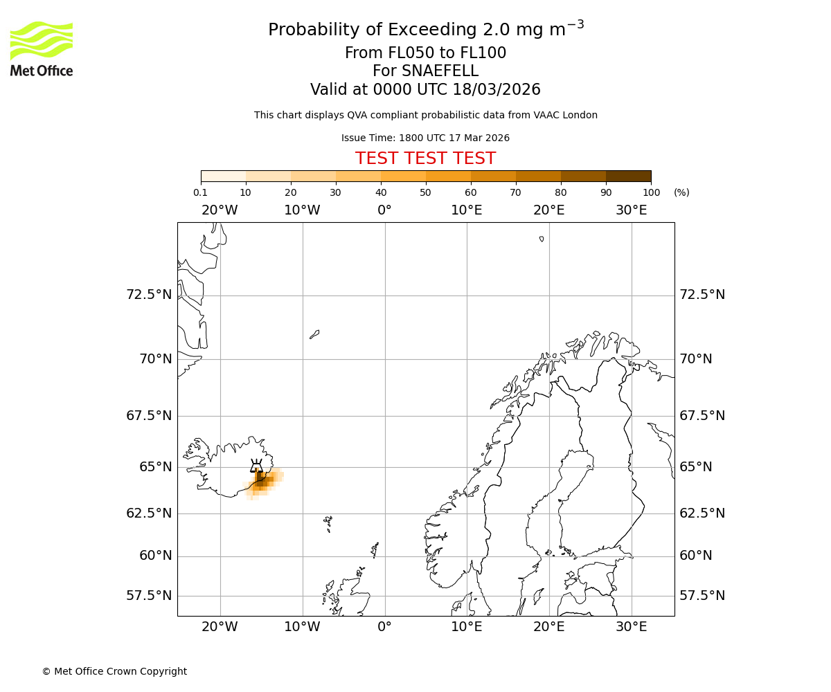 Quantitative Volcanic Ash charts (QVA) are produced in accordance with International Civil Aviation Organization (ICAO) Annex 3 requirements and are provided as well as the London Volcanic Ash Advisory Graphics (VAG) and Advisories (VAA). The lowest QVA threshold (0.2 mg/m³) matches to the areas depicted in the VAA and VAG. Both expected ash concentration and probabilistic forecast information is provided in the chart viewer below for eruptions occurring in the London Volcanic Ash Advisory Centre (VAAC) area of responsibility.