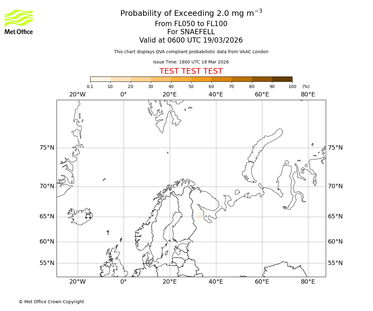 Probability of exceeding 2.0 milligrams per metre cubed. From 000 to 050 for SNAEFELL. Valid at 0600 UTC 19/03/2026