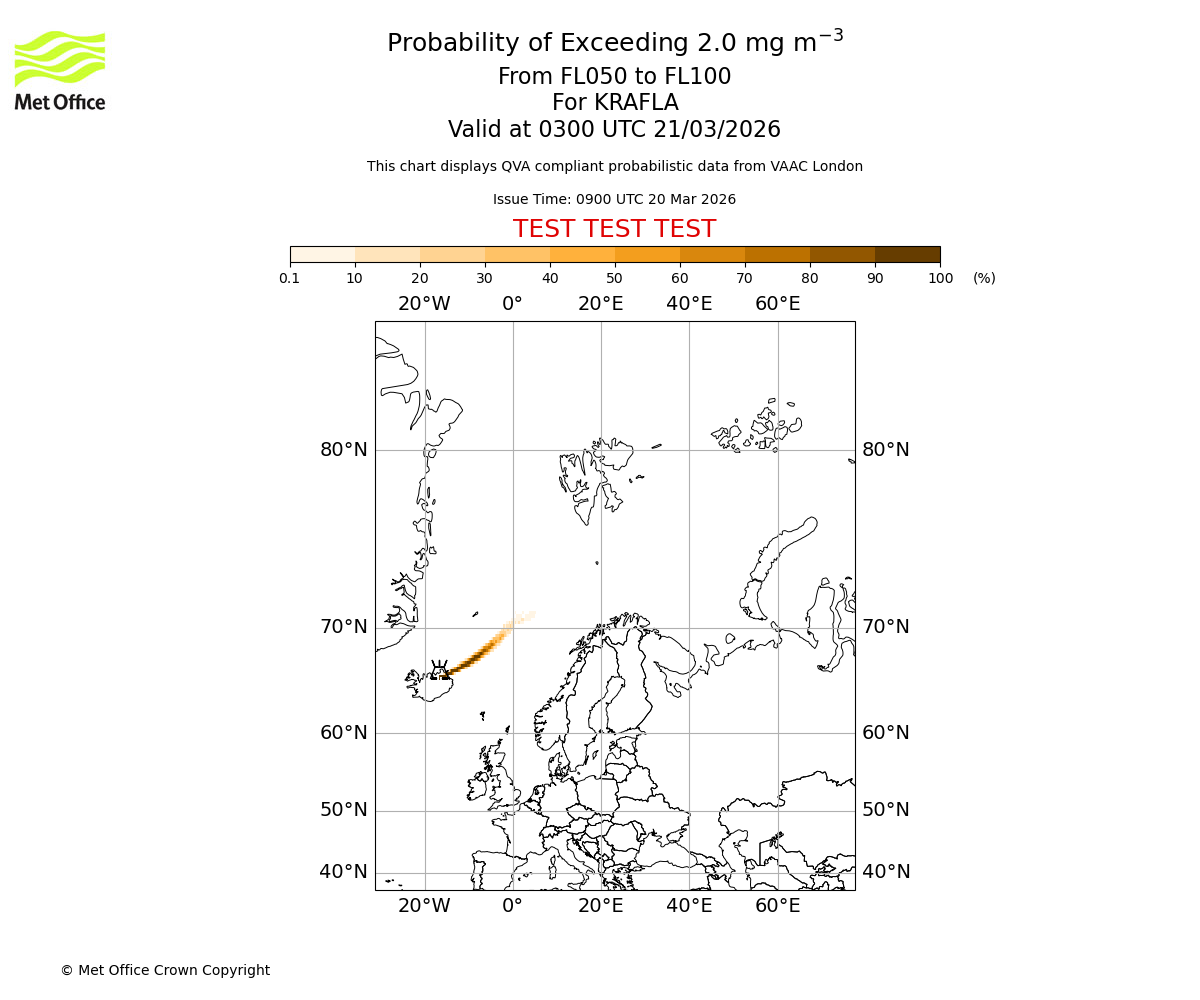 Probability of exceeding 2.0 milligrams per metre cubed. From 000 to 050 for KRAFLA. Valid at 0300 UTC 21/03/2026