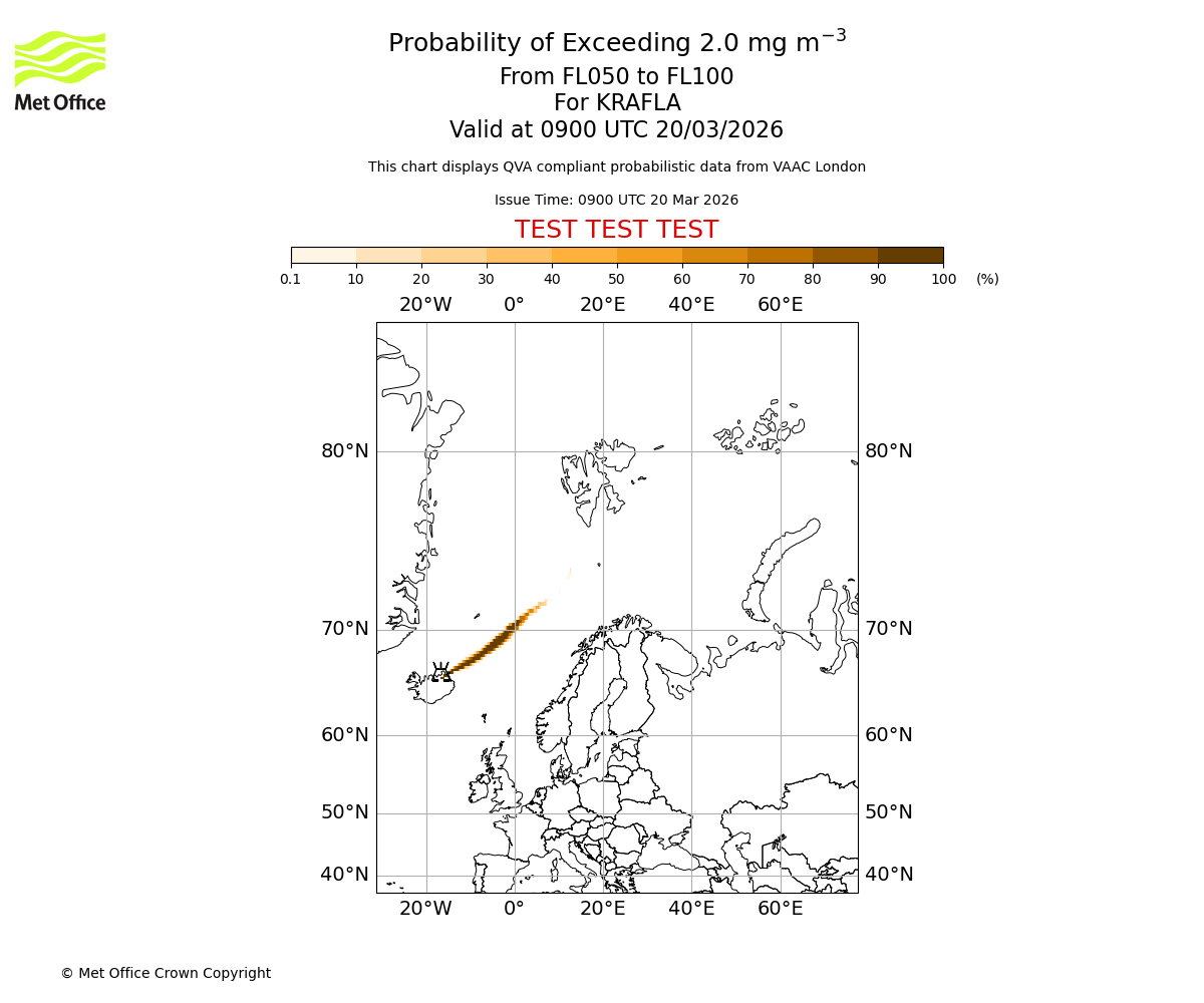 Probability of exceeding 2.0 milligrams per metre cubed. From 000 to 050 for KRAFLA. Valid at 0900 UTC 20/03/2026