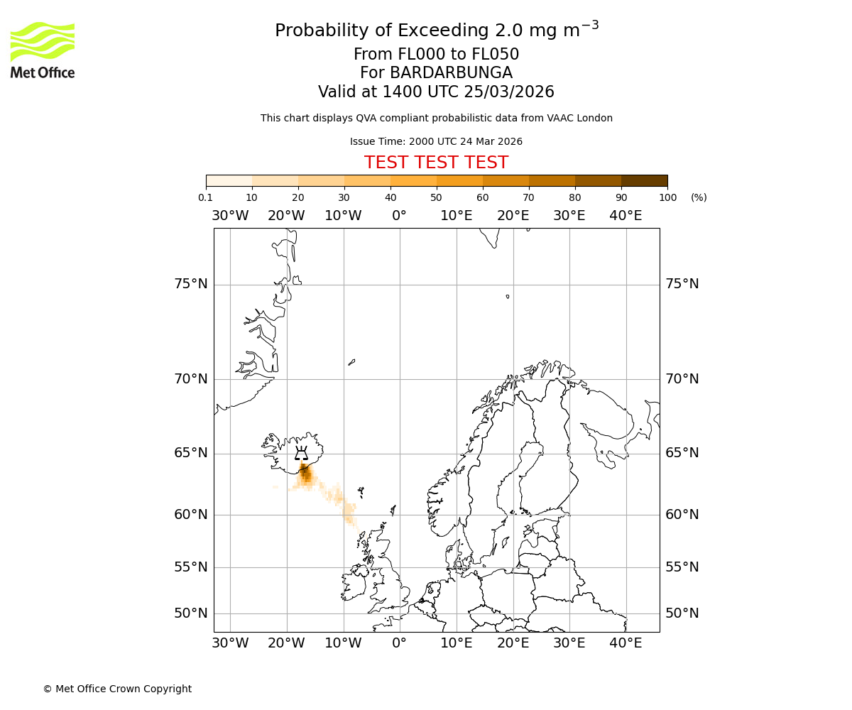 Probability of exceeding 2.0 milligrams per metre cubed. From 000 to 050 for BARDARBUNGA. Valid at 1100 UTC 25/03/2026