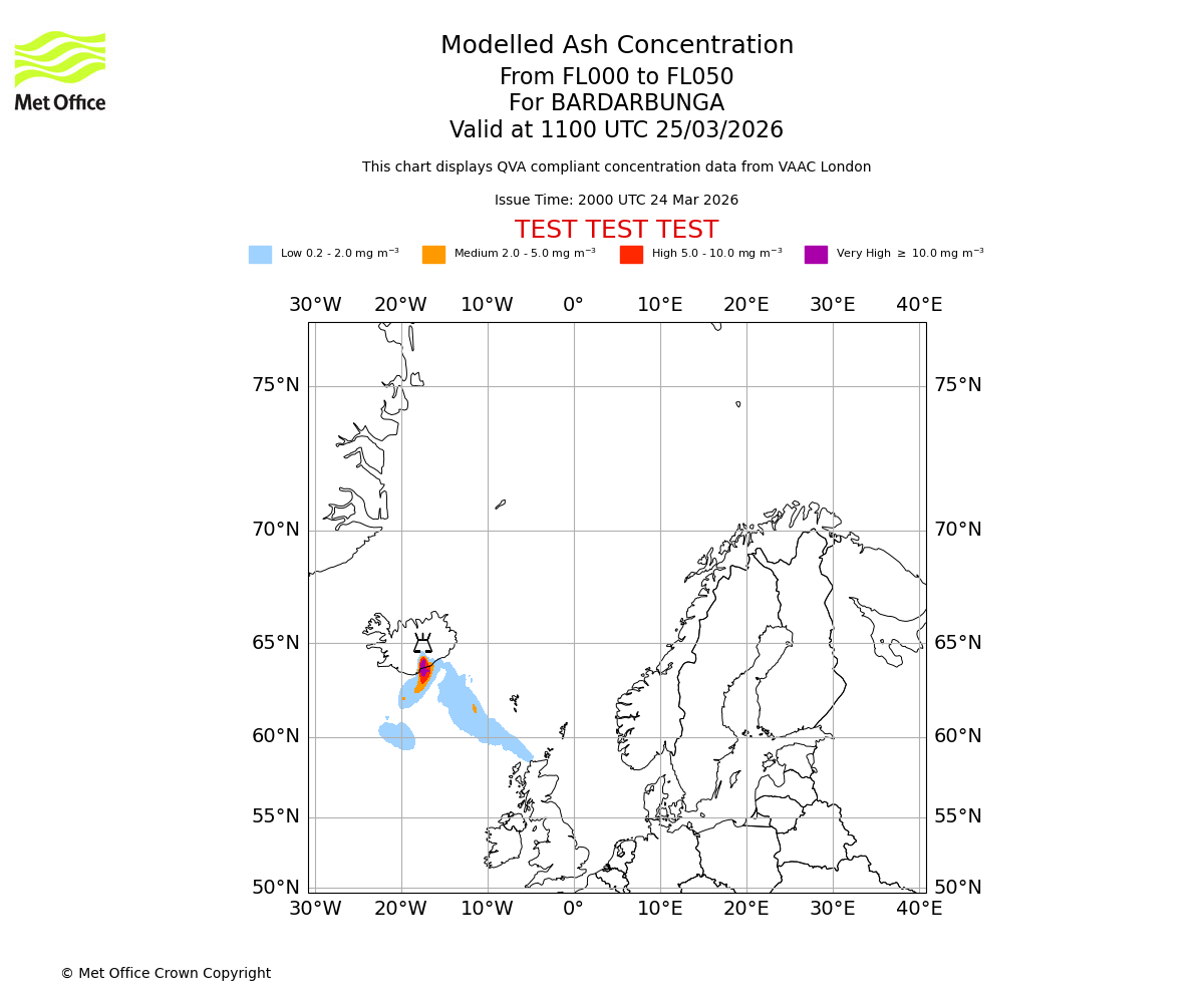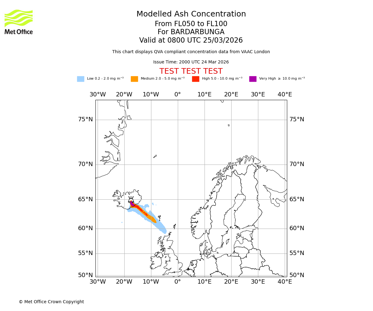 Modelled ash concentration from 000 to 050 for BARDARBUNGA. Valid at 0800 UTC 25/03/2026