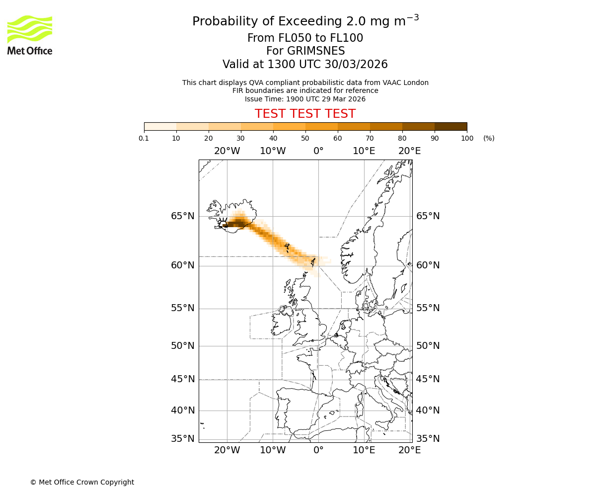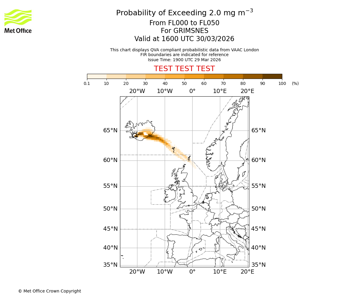 Quantitative Volcanic Ash charts (QVA) are produced in accordance with International Civil Aviation Organization (ICAO) Annex 3 requirements and are provided as well as the London Volcanic Ash Advisory Graphics (VAG) and Advisories (VAA). The lowest QVA threshold (0.2 mg/m³) matches to the areas depicted in the VAA and VAG. Both expected ash concentration and probabilistic forecast information is provided in the chart viewer below for eruptions occurring in the London Volcanic Ash Advisory Centre (VAAC) area of responsibility.