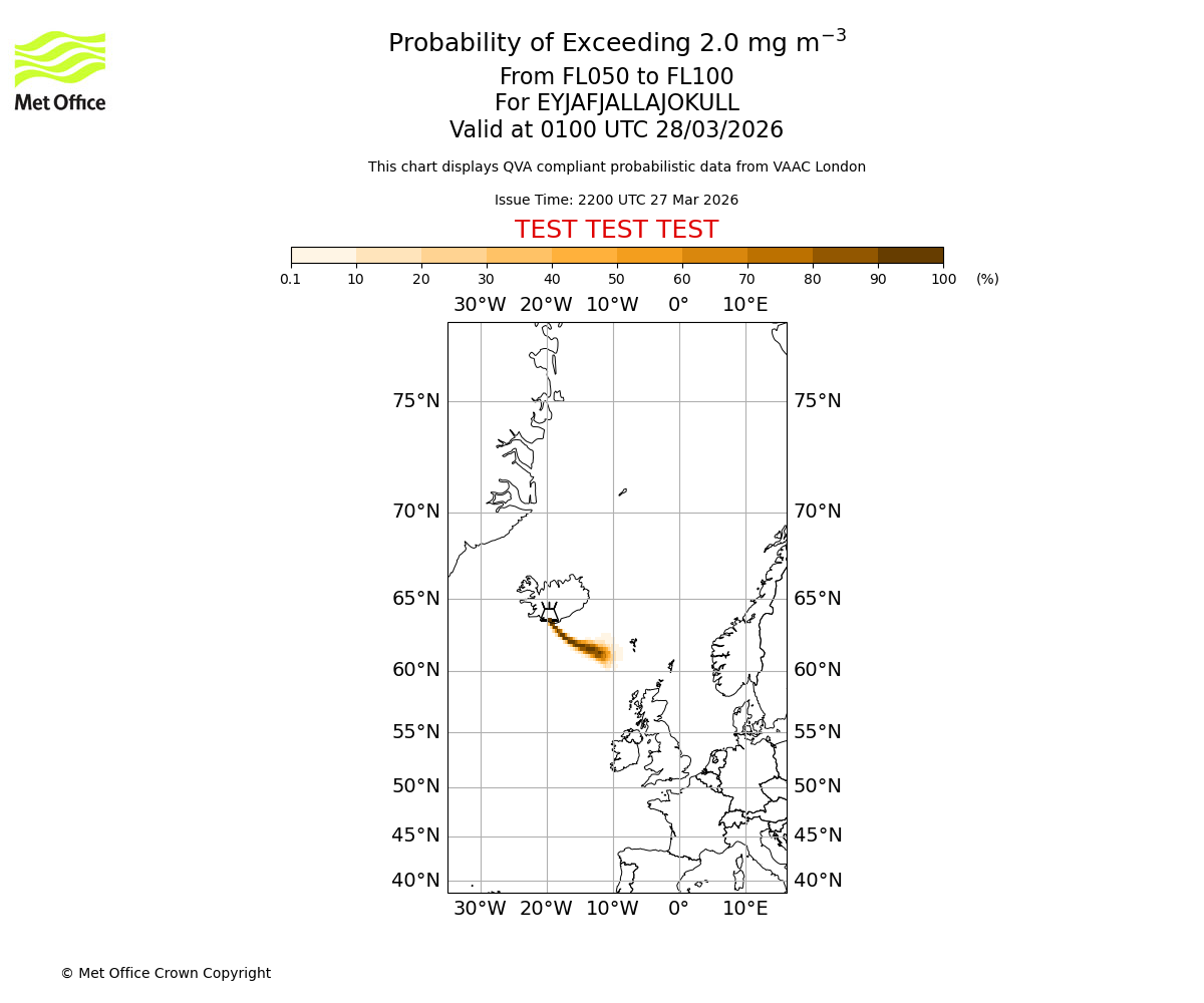 Probability of exceeding 2.0 milligrams per metre cubed. From 000 to 050 for EYJAFJALLAJOKULL. Valid at 0100 UTC 28/03/2026
