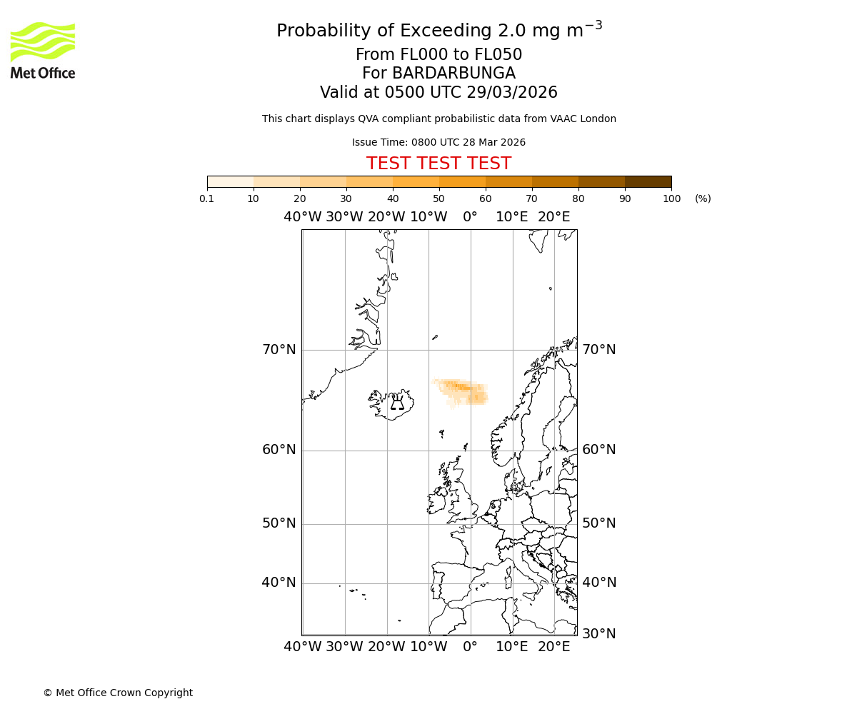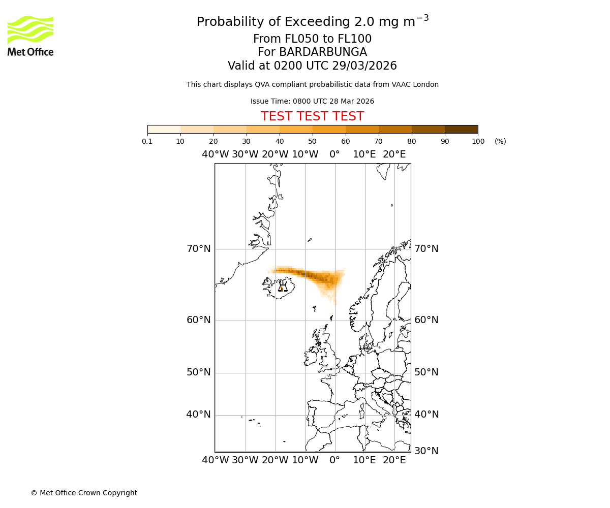 Probability of exceeding 2.0 milligrams per metre cubed. From 000 to 050 for BARDARBUNGA. Valid at 0200 UTC 29/03/2026